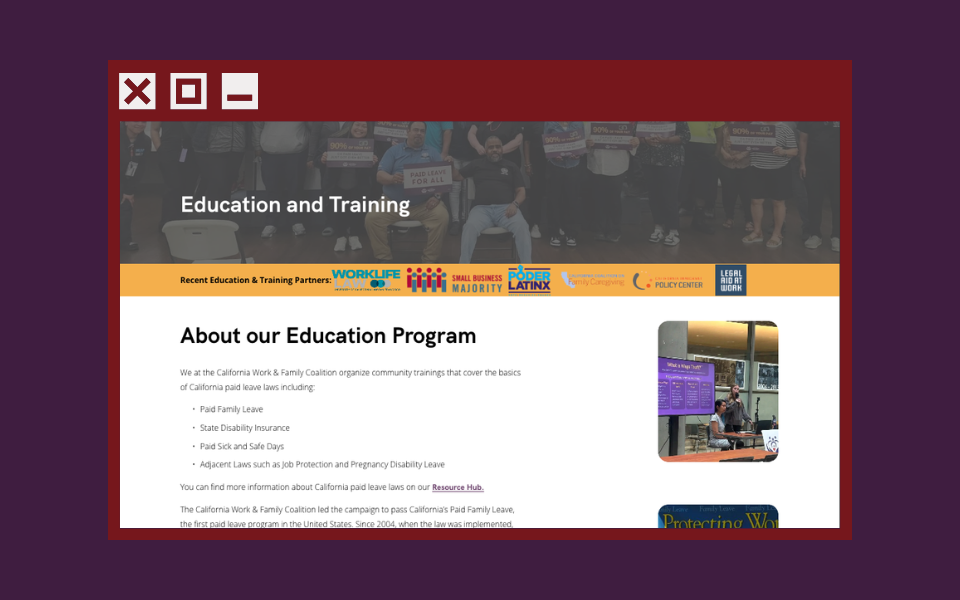 First up, we just launched our Education & Training page! Head over to see the kinds of webinars and trainings we host and learn about the paid leave topics we cover, including Paid Family Leave, State Disability Insurance, Paid Sick & Safe Days, and more. While you’re there, be sure to check out our Resource Hub to see all of the resources we've compiled to help California workers understand and navigate their paid leave rights.