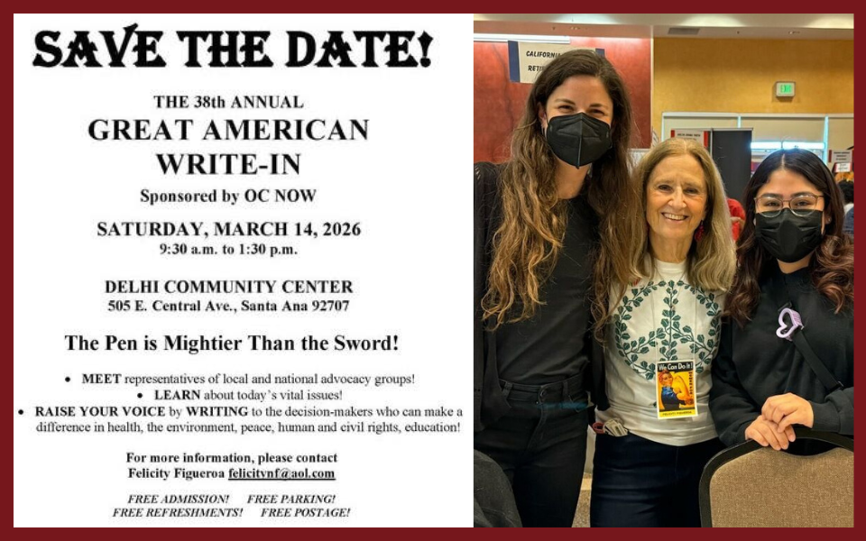 Hosted by Women For: Orange County, the 38th Annual Great American Write-in is coming up on March 14 from 9:30 am - 1:30 pm at the Delhi Center in Santa Ana (505 E. Central Ave). This event is a great way to join others from around Orange County in speaking out on important state and federal issues by writing to lawmakers about civil rights, health care, education, and more!